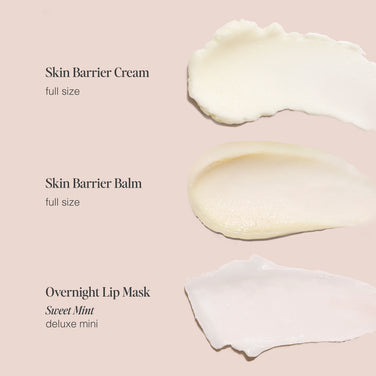 How To Use It: After cleansing, smooth on a generous layer of the Skin Barrier Cream to your face and neck to restore hydration and calm sun-stressed skin. Use morning and night as needed. Press the Skin Barrier Balm onto dry, irritated, or sensitive areas for targeted relief- or apply all over to seal in moisture. Perfect for cheeks, around the nose, or anywhere your skin needs extra support. Swipe on a thick layer of the Overnight Lip Mask in Sweet Mint before bed to deeply hydrate and refresh. Reapply anytime for a cooling, minty boost.