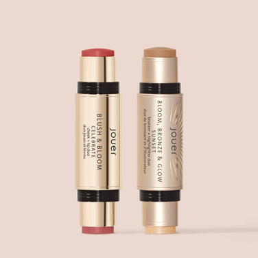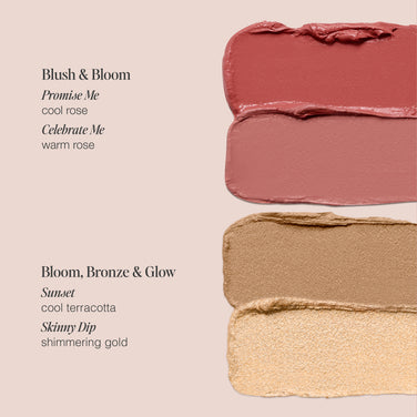 How To Use It: Swipe the Blush & Bloom Duo onto cheeks or lips and blend with fingers or a brush or sponge. Layer both colors for a multi-dimensional look. Using fingers, a brush, or a sponge, blend the Bloom Bronze & Glow Duo where the sun would hit your face naturally: bronzer on cheeks and temples, highlighter on cheekbones, brow bones and cupid's bow.