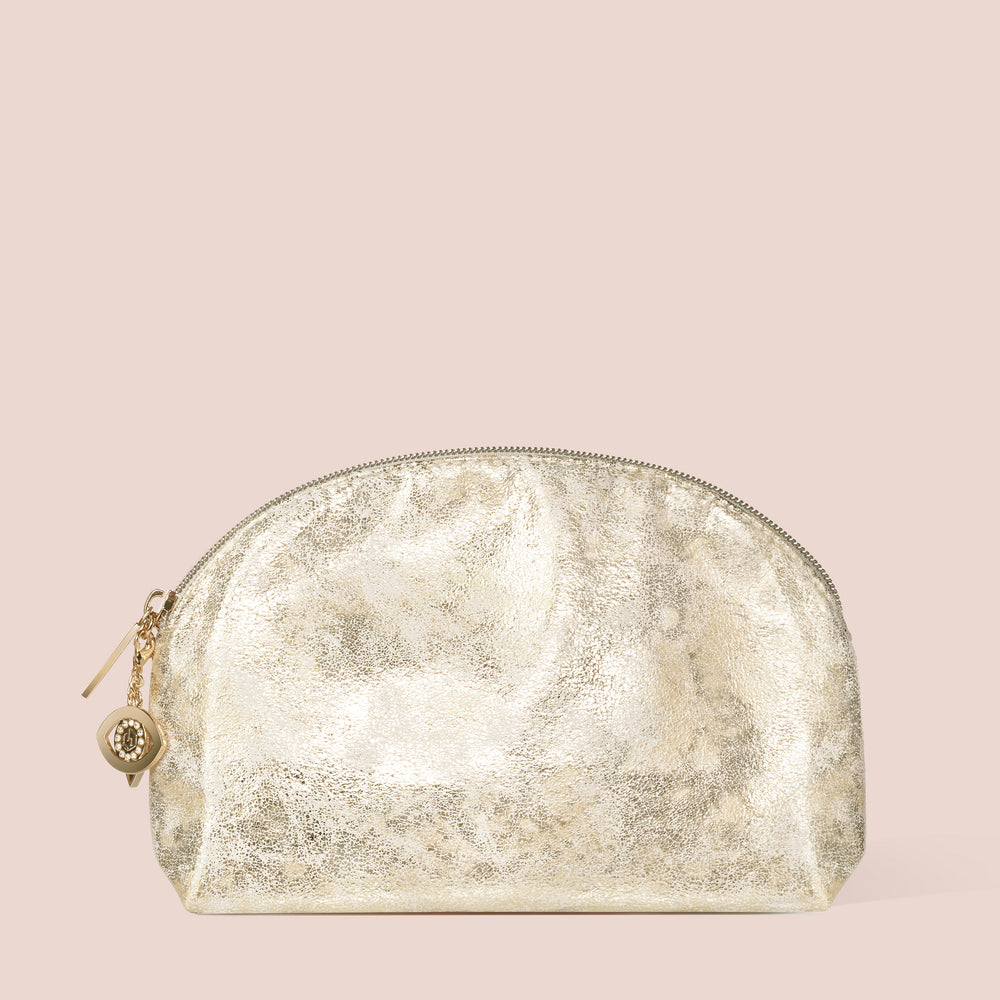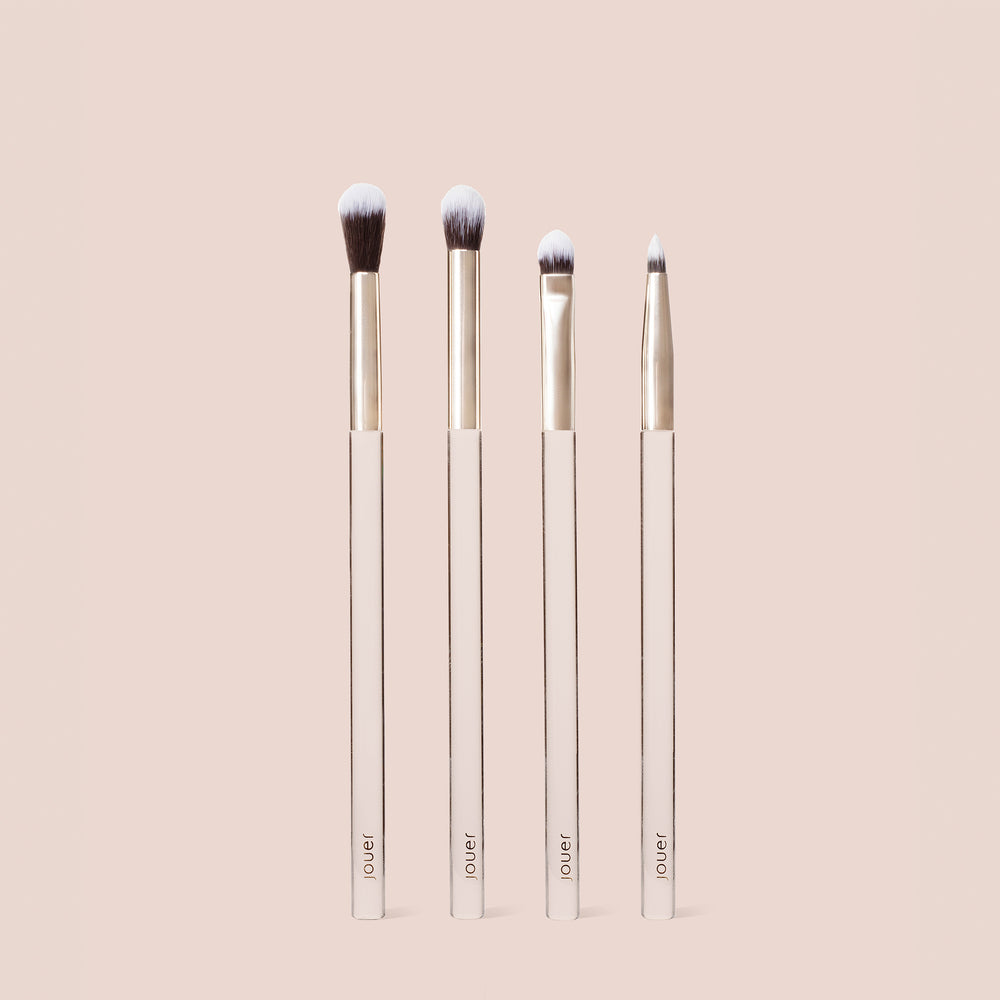 The Eyeshadow Brush Set features a thick Liner Brush, small Eyeshadow Brush, fluffy Blending Brush, and luxe Crease Brush housed in a vintage gold vegan makeup bag adorned with lucky charms.