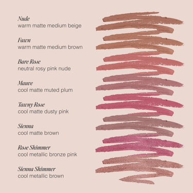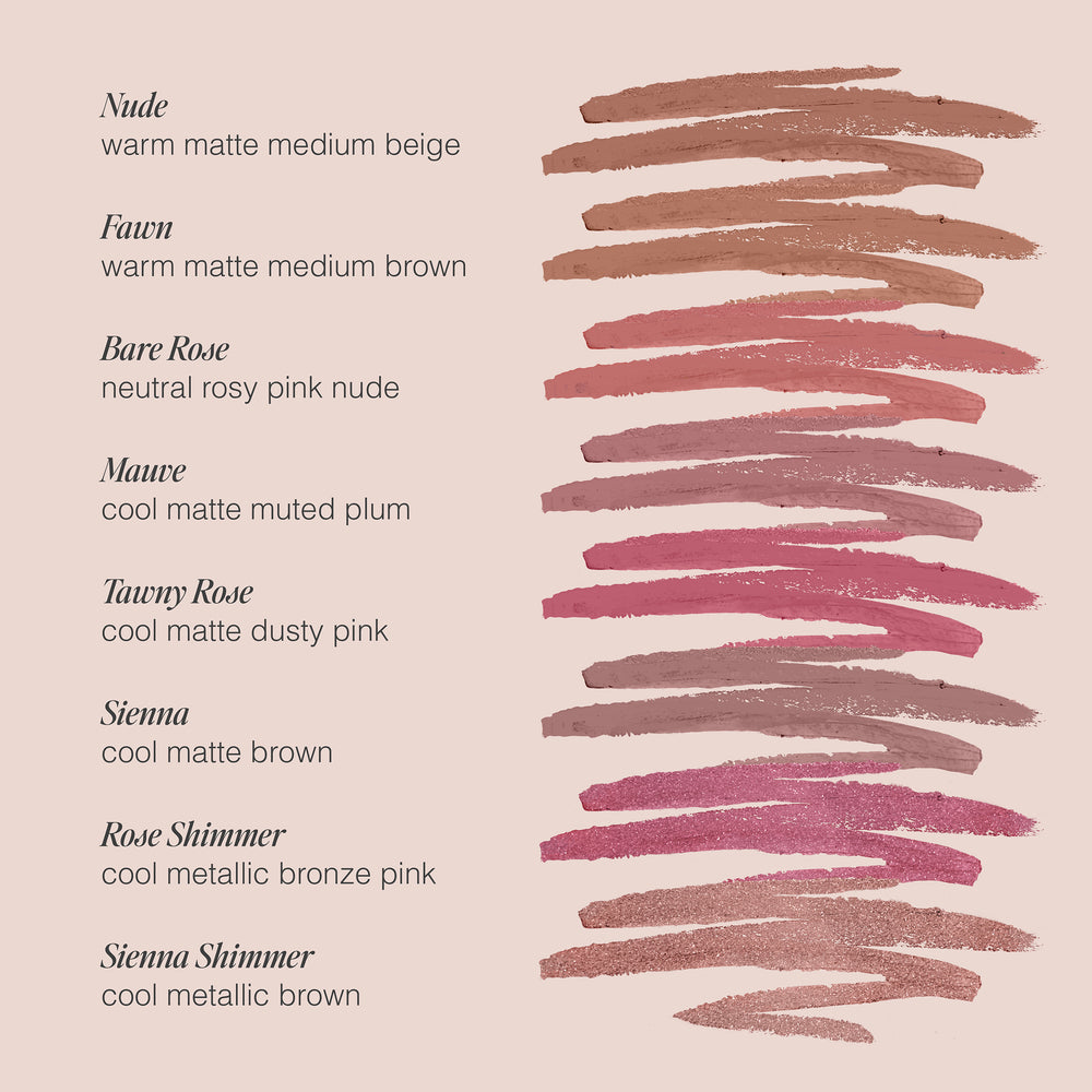 Matte Shades:Fawn (TC-108- 101B), Nude (HM-209-085B), Tawny Rose (TC-108-102) Sienna (HM-209-084B). Ingredient List: Cyclopentasiloxane Trimethylsiloxysilicate Ozokerite Polyethylene Silica Octyldodecanol Phenoxyethanol Caprylyl Glycol Ethylhexylglycerin Hexylene Glycol Cera Alba (beeswax) Tocopherol. MAY CONTAIN: +/- Titanium Dioxide (CI 77891) Iron Oxides (CI 77489, CI 77491, CI 77492, CI 77499) Blue 1 lake (CI 42090) Manganese Violet (CI 77742) Yellow 5 lake (CI 19140) Red 6 lake (CI 15850) Red 7 lake (CI 15850).