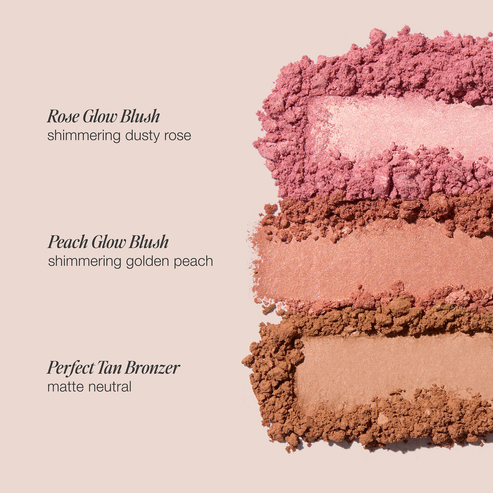 Rose Glow Blush, Peach Glow Blush, & Perfect Tan Bronzer: Mica, Synthetic Fluorphlogopite, Ethylhexyl Palmitate, Zinc Stearate, Silica, Boron Nitride, Dimethicone, Phenoxyethanol, Dimethicone/Vinyl Dimethicone Crosspolymer, Caprylyl Glycol, Tin Oxide, Hexylene Glycol, Ethylhexylglycerin, Tocopheryl Acetate. May Contain/Peut Contenir (±): CI 77891 (Titanium Dioxide), CI 77491, CI 77492, CI 77499 (Iron Oxides), CI 15850 (Red 7 Lake), CI 15850 (Red 6), CI 19140 (Yellow 5 Lake), CI 77742 (Manganese Violet).