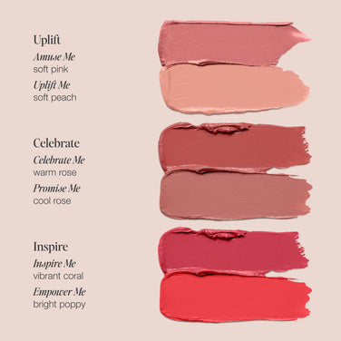 Amuse Me/Uplift Me:Methyl Methacrylate Crosspolymer, Triethylhexanoin, Dimethicone, Polyethylene, Hydrogenated Polydecene, Isostearyl Alcohol, Cetyl Ethylhexanoate, Caprylyl Methicone, Kaolin, Bis-Diglyceryl Polyacyladipate-2, Cera Microcristallina/Microcrystalline Wax/Cire Microcristalline, Sorbitan Sesquioleate, Candelilla Cera/Euphorbia Cerifera (Candelilla) Wax/Cire de Candelilla, Caprylyl Glycol, Tocopheryl Acetate, Simmondsia Chinensis (Jojoba) Seed Oil, Squalane, Butyrospermum Parkii (Shea Butter), Rosa Moschata Seed Oil, Triethoxycaprylylsilane. May Contain/Peut Contenir (±): CI 77891 (Titanium Dioxide), CI 77491, CI 77492, CI 77499 (Iron Oxides), CI 15850 (Red 6 Lake), CI 15850 (Red 7 Lake), CI 15850 (Red 6), CI 77163 (Bismuth Oxychloride), CI 19140 (Yellow 5 Lake).